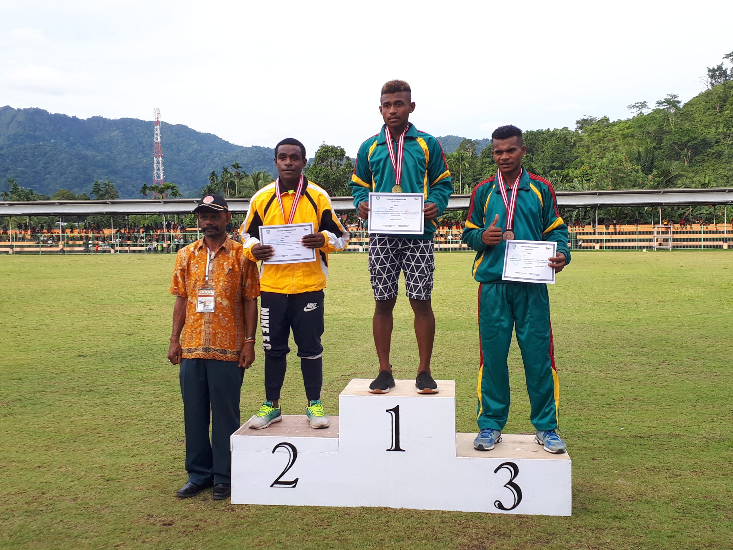 SERUI- Sprinter Kabupaten Nabire Marthinus Rumansara yang berlomba di nomor final 100 meter kategori remaja putra Kejuaraan Daerah (Kejurda) Atletik Kabupaten/Kota Se-Provinsi Papua berhasil menyabet medali emas. Rumansara mencatatkan namanya sebagai pelari tercepat di lintasan atletik stadion Marora Serui dengan waktu finish 11.04 detik.
