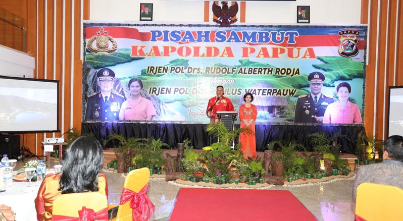 Pisah Sambut Kapolda Papua Dari Pejabat Lama Irjen Pol Drs. Rudolf Alberth Rodja Kepada Pejabat Baru Irjen Pol Drs. Paulus Waterpauw, dihadiri Gubernur Provinsi Papua Lukas Enembe, S.IP, M.H., Pangdam XVII/Cendrawasih Mayjen TNI Herman Asaribab, Kasdam XVII/Cendrawasih Brigjen TNI Irham Waroihan, S.Sos., Danlanud Silas Papare Marsma TNI Ir. Tri Bowo Budi Santoso, Danlantamal X Brigjen TNI Mar Nurri Andrianis Djatmika. Kepala Kejaksaan Tinggi Papua Dr. Heffinur, SH., M. Hum. Kabinda Papua Brigjen TNI A. H. Napoleon dan Wakapolda Papua Brigjen Pol Drs. Yakobus Marzuki.