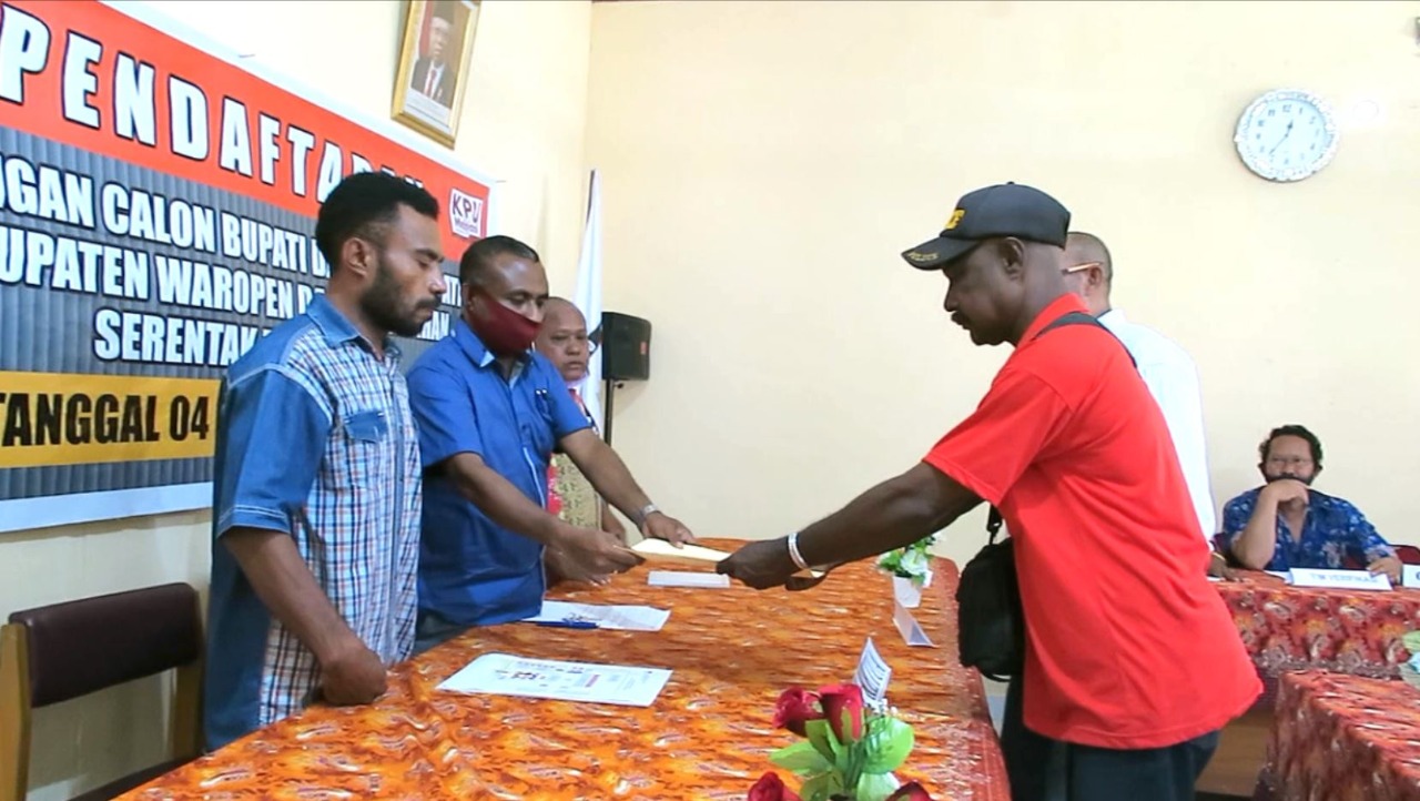 Simulasi ini dalam rangka mempersiapkan prosedur pendaftaran. Pendaftaran Bakal Pasangan Calon (Bapaslon) Bupati Dan Wakil Bupati Kabupaten Waropen Tahun 2020 akan berlangsung selama 3 (tiga) hari dimulai tanggal 4-6 September 2020 di Kantor KPU Waropen, di Nonomi distrik Waropen Bawah.