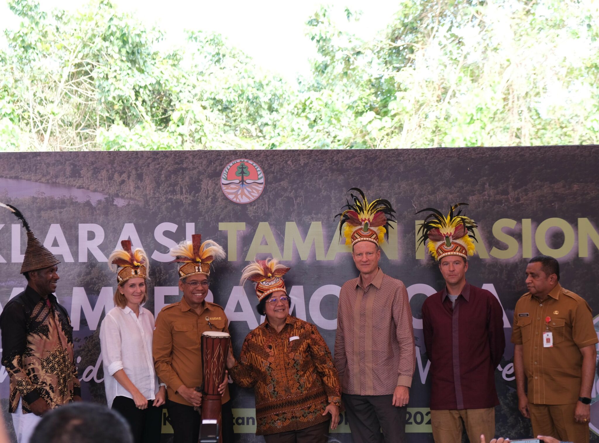 Sebagai bentuk simbolik pendeklarasian Taman Nasional Mamberamo Foja, Menteri LHK didampingi Dirjen KSDAE, Duta Besar Norwegia, perwakilan dari Bezos Earth Fund, dan tamu VVIP, memukul tifa, alat musik tradisional Papua.