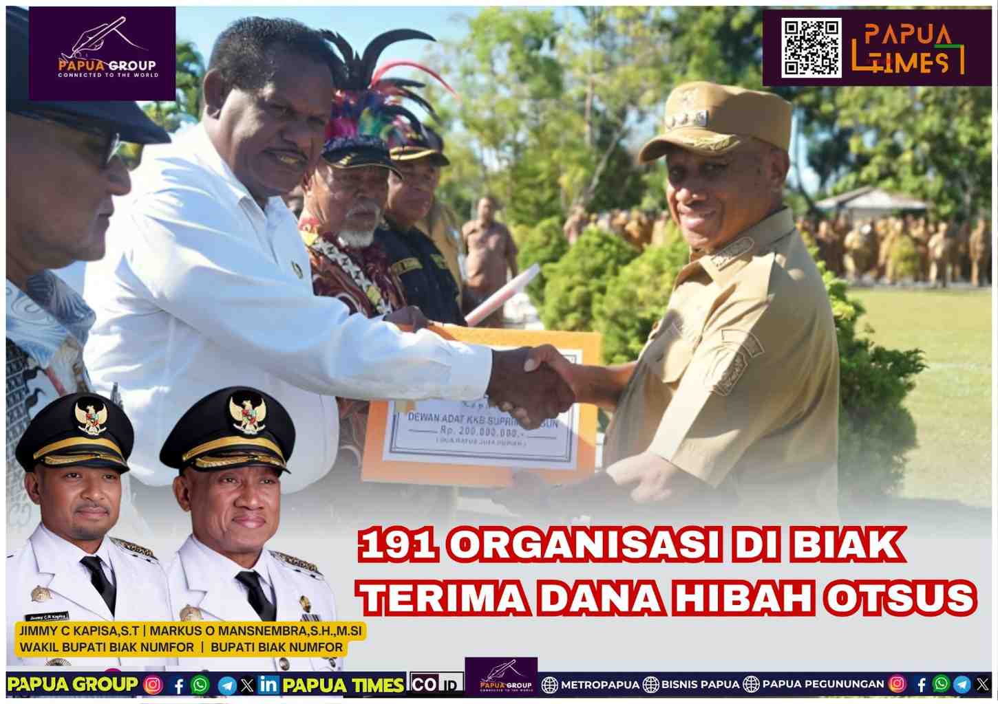 BIAK | Bupati Markus Octovianus Mansnembra menyerahkan dana hibah sebesar Rp.19. 617.360.000 untuk 191 lembaga atau organisasi yang berada di Kabupaten Biak Numfor.