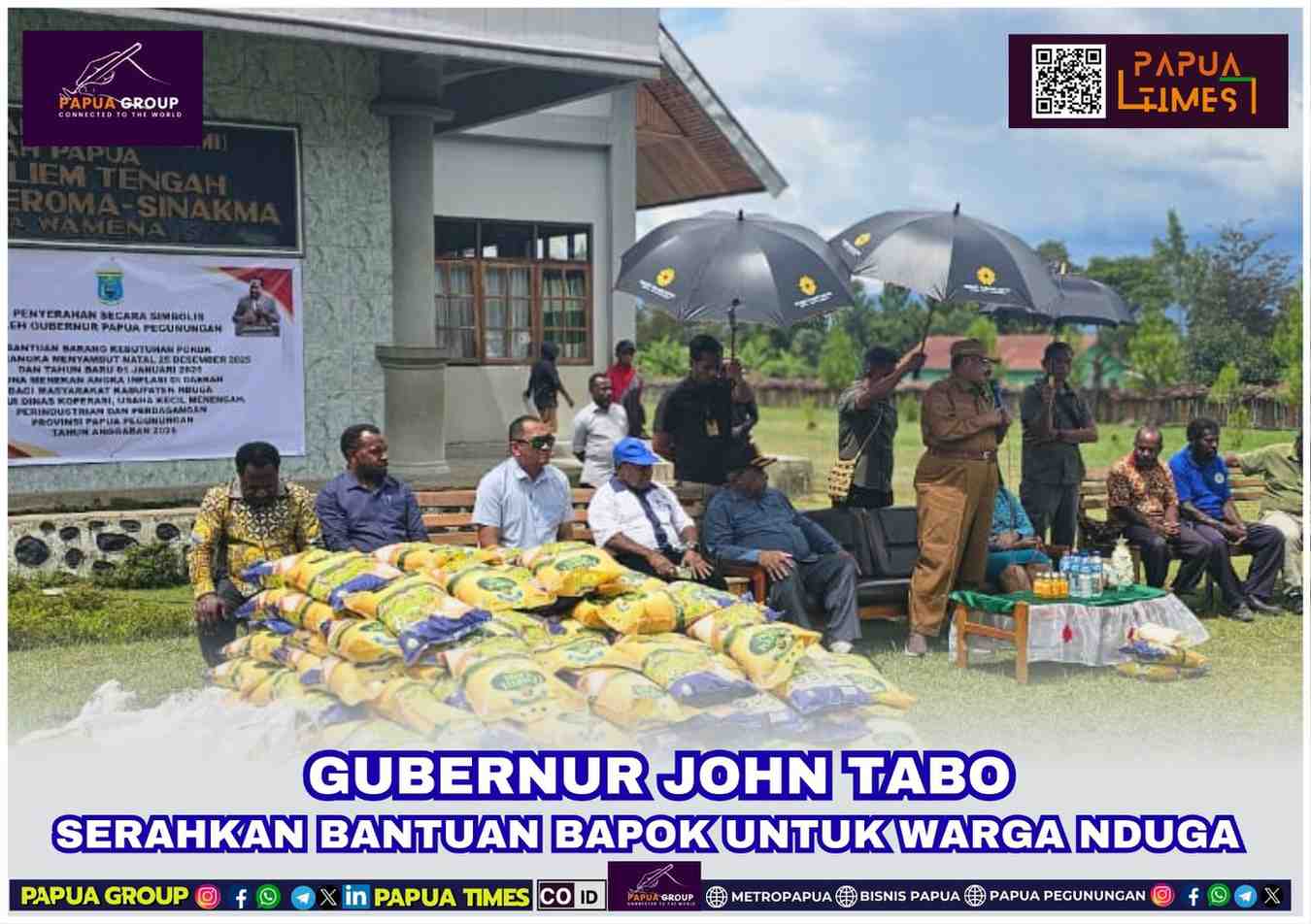 WAMENA | Menyambut Hari Raya Natal 25 Desember 2025 dan Tahun Baru 1 Januari 2026, Gubernur Papua Pegunungan, Dr. (HC) John Tabo,S.E.,M.B.A secara simbolis menyerahkan bantuan Bahan Pokok (Bapok) bagi masyarakat Kabupaten Nduga.