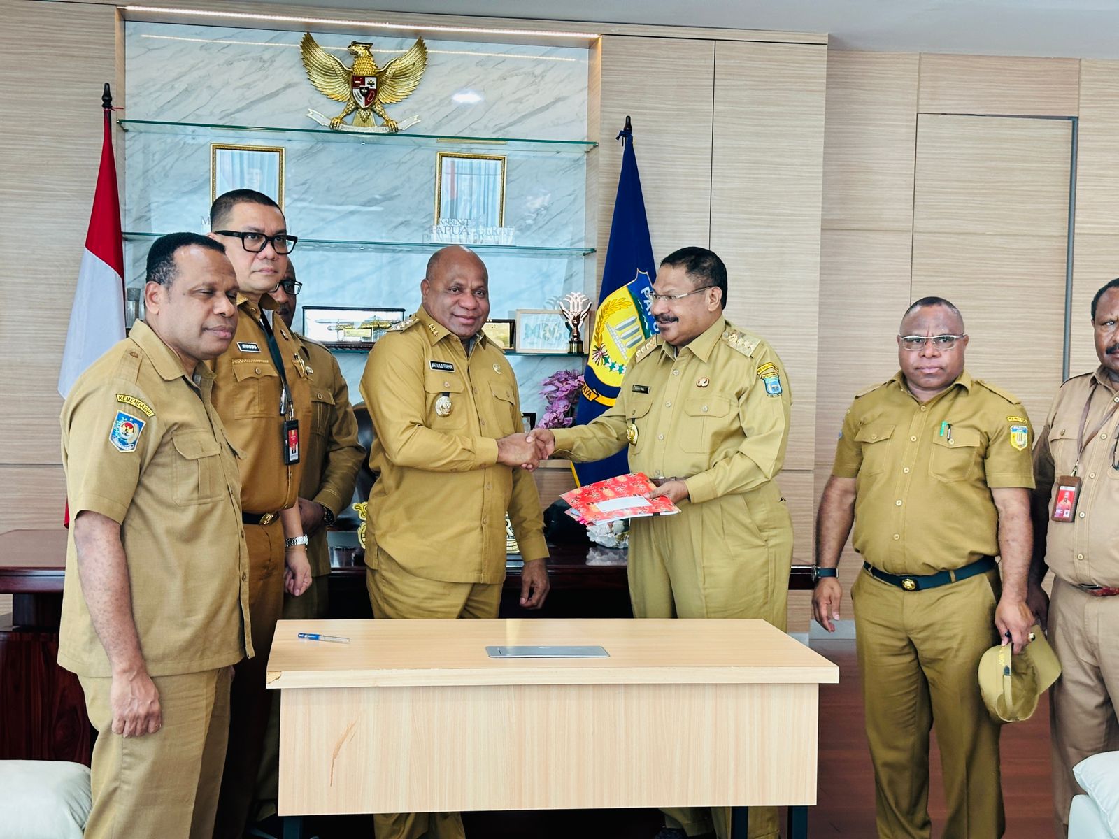 Penandatanganan Berita Acara Serah Terima Barang Milik Daerah Antara Pemerintah Provinsi Papua dengan Pemerintah Provinsi Papua Pegunungan tentang Penyerahan Barang Milik Daerah Pemerintah Provinsi Papua berlangsung di Kantor Gubernur Papua, Dok II Jayapura.