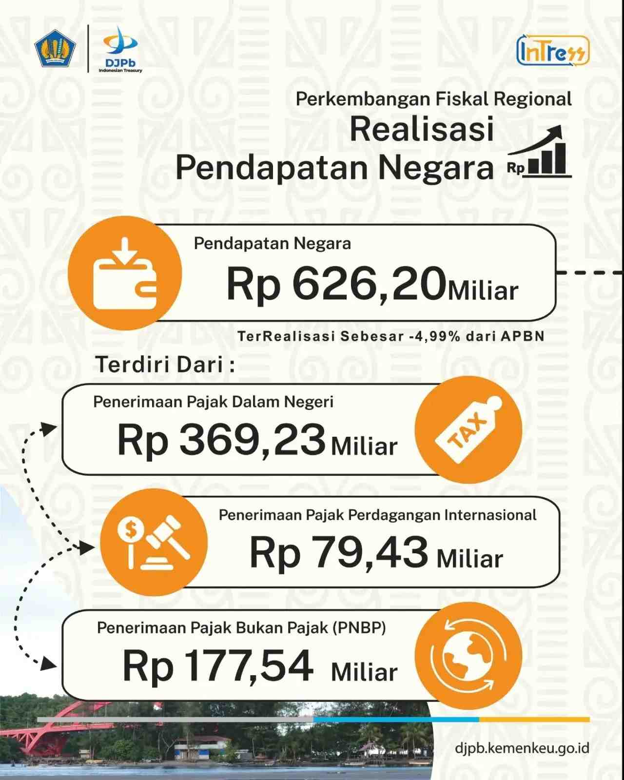 Kepala Kantor Wilayah Direktorat Jenderal Perbendaharaan Provinsi Papua (Kanwil DJPb Provinsi Papua, Izharul Haq mengatakan realisasi pendapatan negara tercatat sebesar Rp626,20 miliar atau 9,24 persen dari target yang ditetapkan.