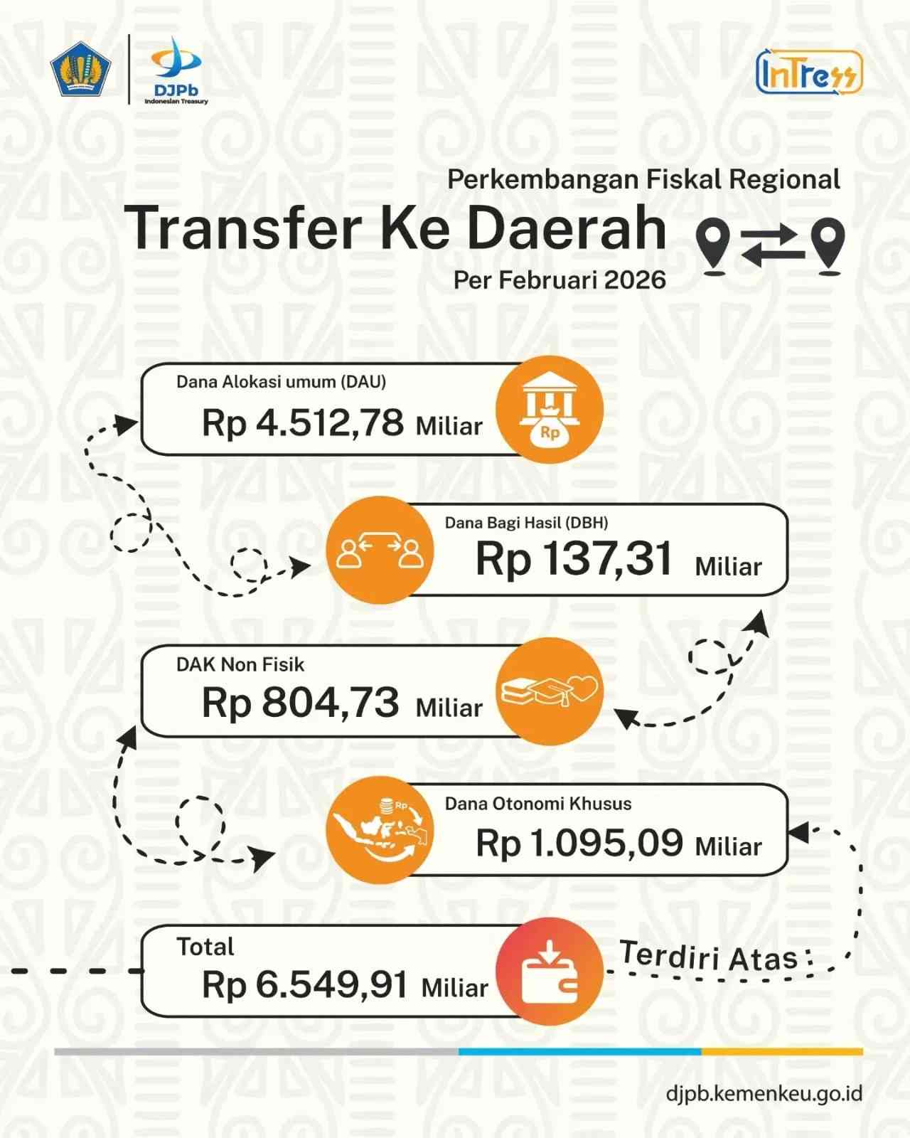 TKD ke Provinsi Papua terdiri dari Dana Alokasi Umum (DAU) Rp4.512 triliun, Dana Bagi Hasil (DBH) Rp137,31 miliar, DAK Non Fisik Rp804.73 miliar dan Dana Otonomi Khusus Rp1,095 triliun