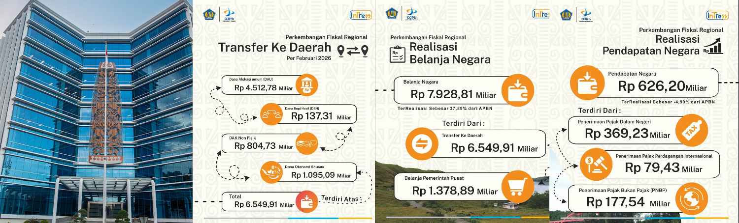 Di sisi lain, komponen transfer ke daerah tetap mendominasi struktur belanja negara di Papua. Realisasi transfer ke daerah hingga Februari 2026 mencapai Rp6,55 triliun atau 18,04 persen dari pagu, dengan pertumbuhan sebesar 30,12 persen secara tahunan.